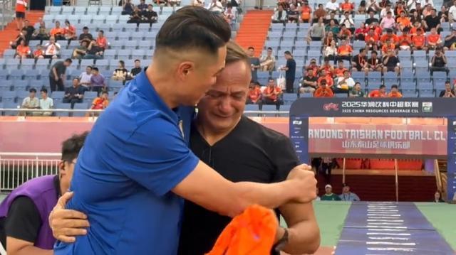 面对这位远道而来的老友,巴力斯塔曾经的老队友、现泰山队副总经理宿茂臻也献上了深情拥抱,并赠送巴力斯塔一件泰山队球衣。看到老队友宿茂臻,巴力斯塔也难掩激动之情,两人拥抱良久互相致意。随后巴力斯塔面对全场球迷的热情掌声,忍不住激动落泪。